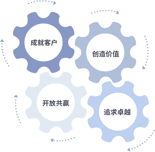 成就客户是一切决策的出发点,,创造价值是衡量所有工作的标准,,,,追求卓越是我们做事做人的态度,,开放共赢是我们的格局也是最终的结果。。价值观的齿轮环环相扣,,推动着组织里的每个人不断向前。。。。